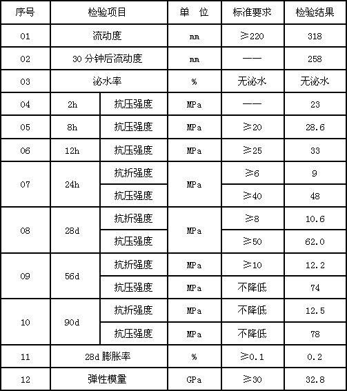 其性能指標(biāo)符合《京滬高速鐵路高性能混凝土施實(shí)施細(xì)則》與《客運(yùn)專(zhuān)線橋梁盆式橡膠支座暫行技術(shù)條件》等國(guó)家與鐵路行業(yè)標(biāo)準(zhǔn)技術(shù)要求。具有優(yōu)異的流動(dòng)性,自流找平,不需振搗,抹壓,施工速度快、方便;具有非常高的小時(shí)強(qiáng)度、后期強(qiáng)度高,不收縮;根據(jù)不同的施工溫度,2小時(shí)即可獲得20-40Mpa的抗壓強(qiáng)度,抗折強(qiáng)度高;具有微膨脹性能及優(yōu)異的抗開(kāi)裂性能;適應(yīng)溫度范圍寬,在-5℃~-35℃條件下,無(wú)需任何輔助保溫或降溫措施都可施工;在高溫或低溫條件下,能夠同時(shí)保證強(qiáng)度發(fā)展和施工流動(dòng)性的需要。