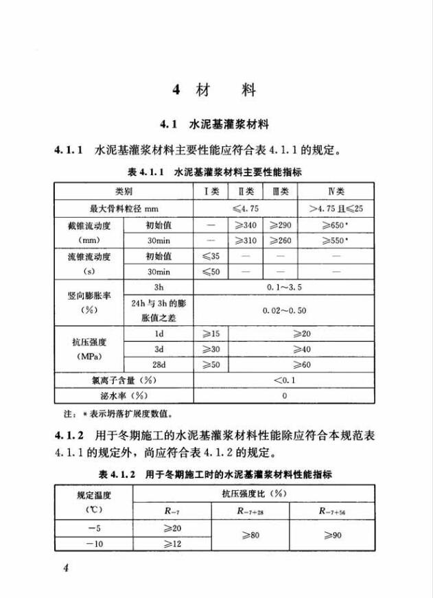 對(duì)于快凝快硬型水泥基灌漿材料,由于早期強(qiáng)度高,甚至2h的抗壓強(qiáng)度能達(dá)到20MPa,其流動(dòng)性損失必然大,因此表4.1.1的30min流動(dòng)度保留值不適用于快凝快硬型水泥基灌漿材料。本規(guī)范對(duì)該類水泥基灌漿材料的流動(dòng)度(或坍落度和坍落擴(kuò)展度)的保留值、24h與3h的豎向膨脹率之差及24h內(nèi)抗壓強(qiáng)度值不作規(guī)定。